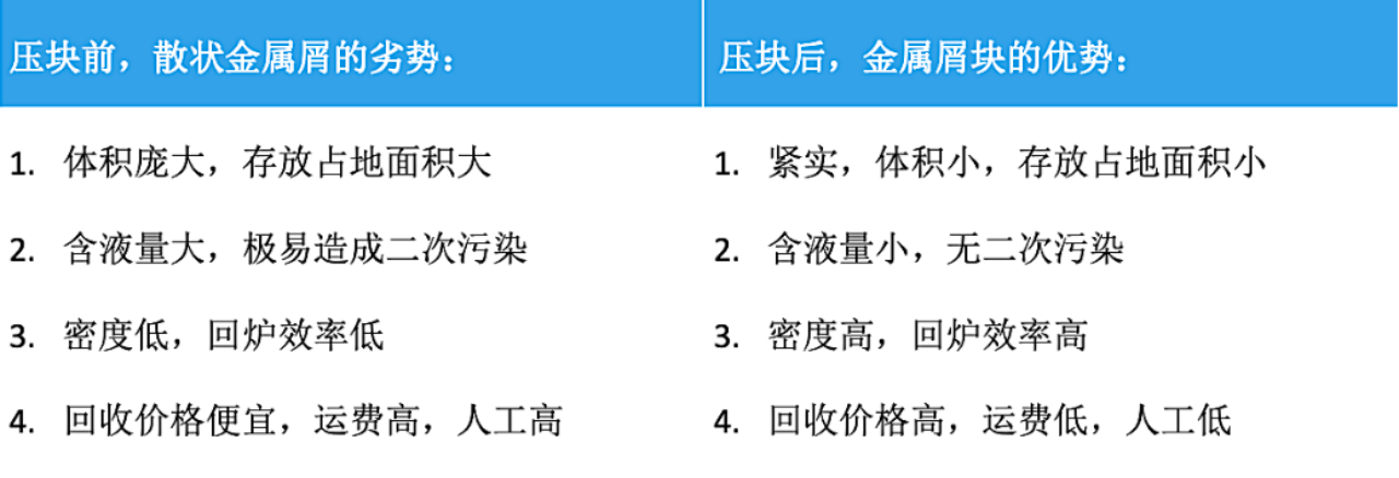 · 30Mpa壓力,壓塊密度高,屑?jí)嚎s比大,壓塊后空間利用率高