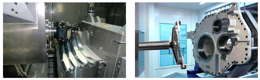 鑄件或焊接齒輪箱具有嚴(yán)格的中心距、圓柱度和垂直度以及嚴(yán)緊的公差帶要求—BW得心應(yīng)手。高剛性轉(zhuǎn)臺(tái)具有最佳的定位精度,允許深孔的雙面加工。較大的轉(zhuǎn)臺(tái)軸承直徑保證必要的高傾覆扭矩,滿足主軸的高位銑削。深孔加工時(shí)使用刀具延伸桿可以將不超過40公斤重的標(biāo)準(zhǔn)刀具延伸350mm,從而進(jìn)行深孔鉆削或端面銑削。